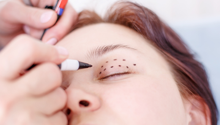 Lokalisierte plastische Chirurgie zur Straffung der oberen Augenlider. Durch den Schnitt wird überschüssiges Gewebe entfernt und das Auge neu geformt.